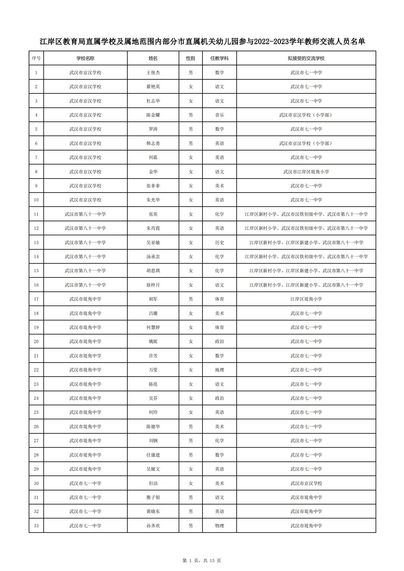 根据《市教育局关于做好推进中小学教师区管校聘改革 做好2022-2023学年教师补充交流工作的通知》和《区教育局关于推进中小学教师区管校聘改革 做好2022-2023学年度教师交流工作的通知》(岸教师【2022】2号)要求,为严格规范教师交流工作的过程管理,在开学初学校完成对本学期派出和接收的区内交流教师名单校内公示的基础上,经汇总,本学年共503名教师参与交流,现将人员名单予以公示,公示时间为2022年9月13日至2022年9月19日。公示期间,如有疑问,请在工作日向江岸区教育局教师工作科(联系电话82220478)咨询和反馈。