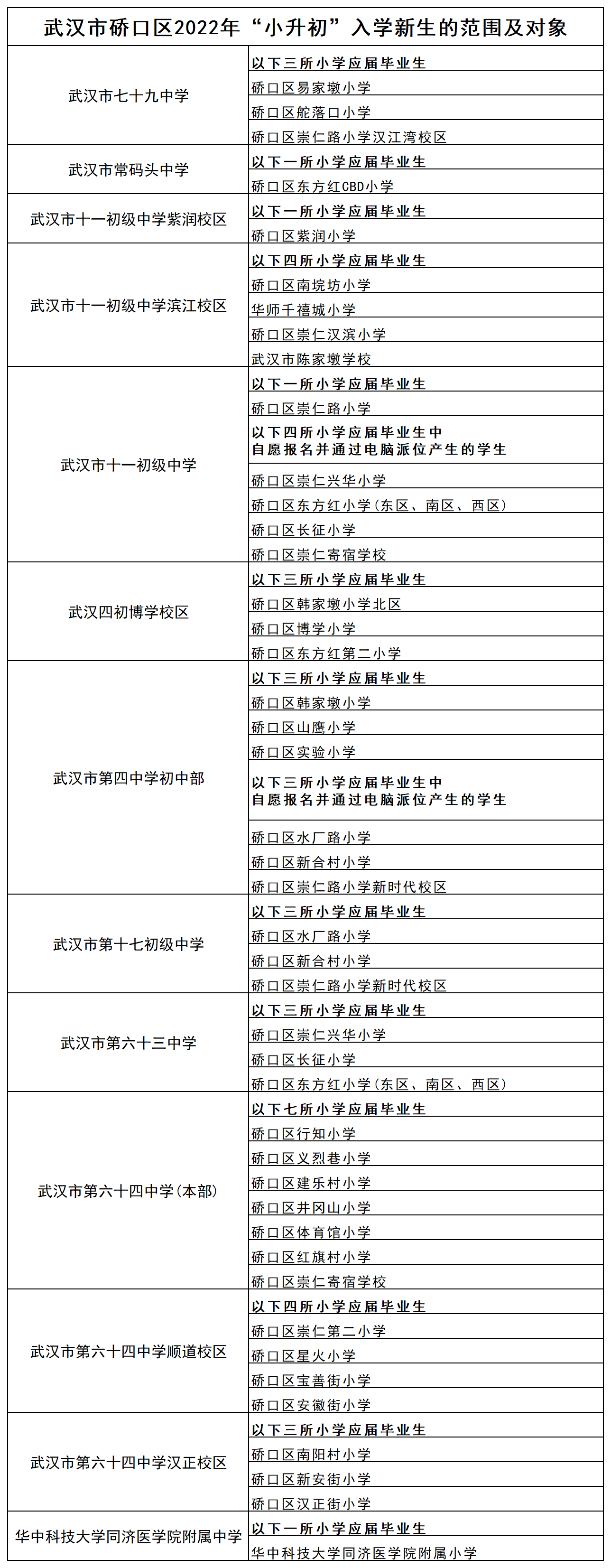 1、大桥中学(咨询电话:黄老师15827061106咨询时间:工作日8:30—12:00、14:30—17:30)招收大花岭小学毕业生。