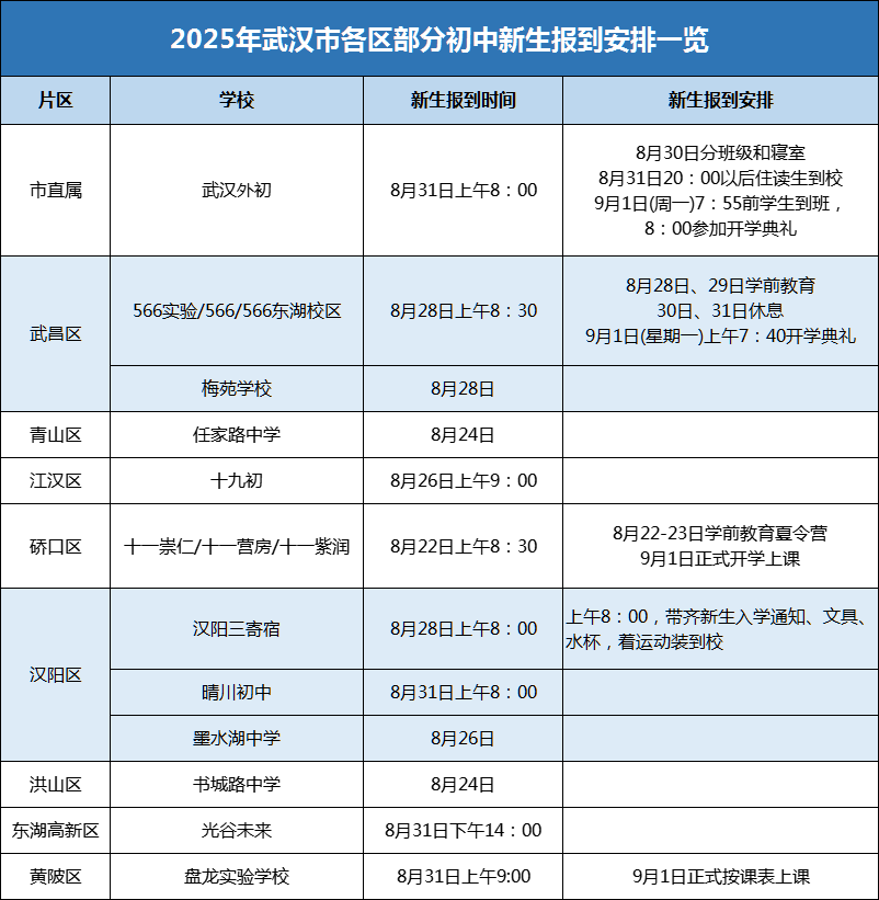 目前部分学校已确定报到和分班安排,如江岸区 “2+4” 有通知,硚口区64初等校电话确定班型;多数未明确的,8月份也将启动。