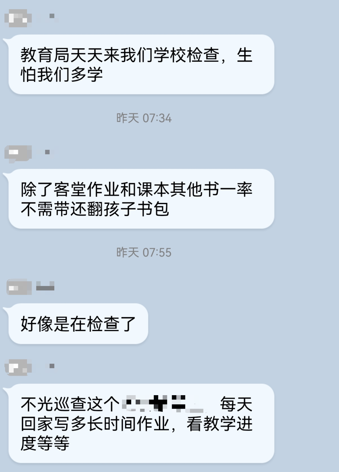 据多位家长分享,教育局近日来学校突击检查,要求不能多学,不能带教辅资料,并询问了学生每天回家写作业的时间,教学进度等等。