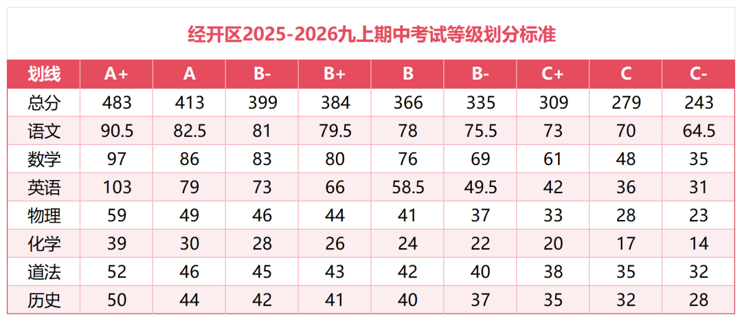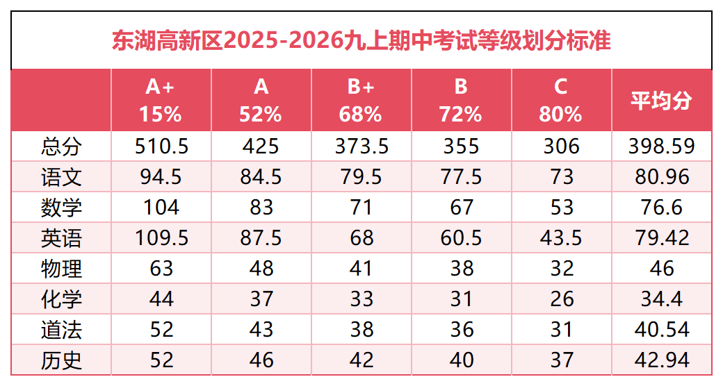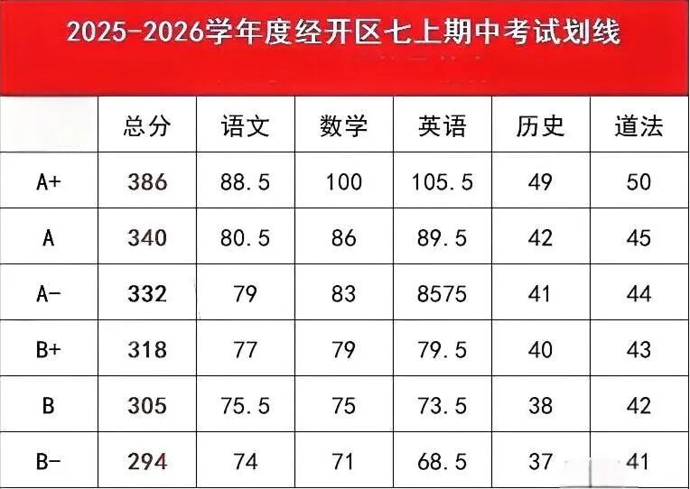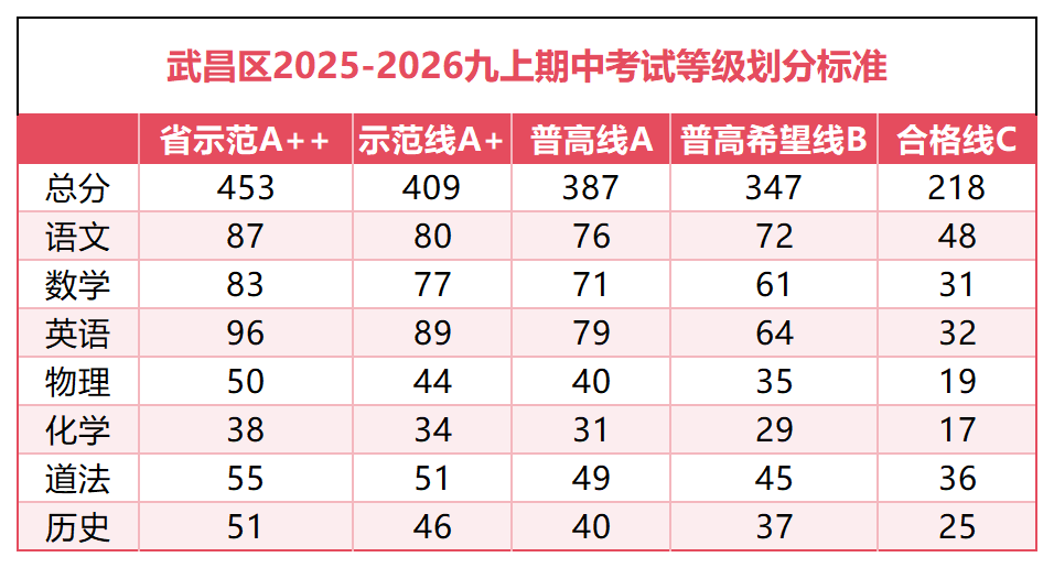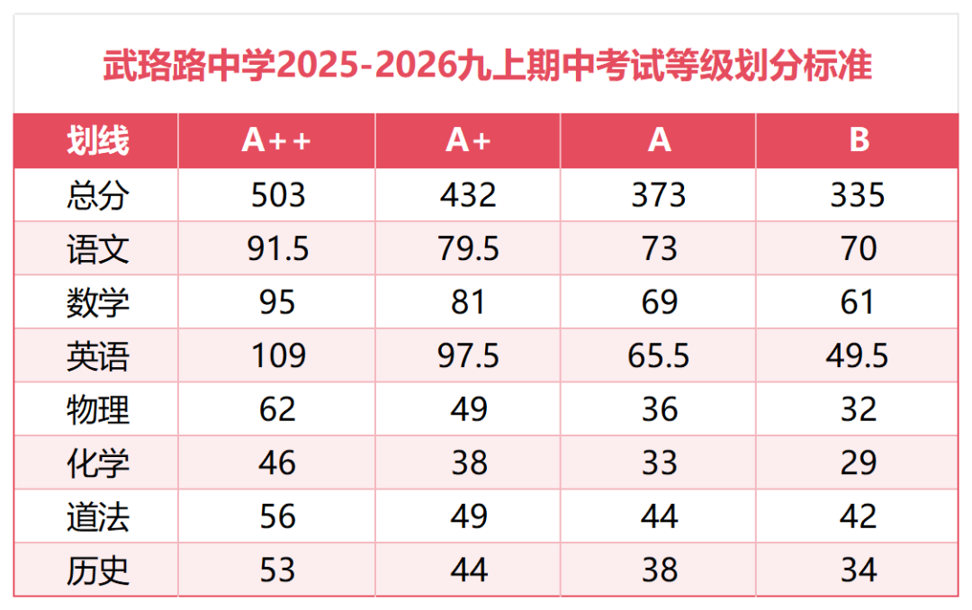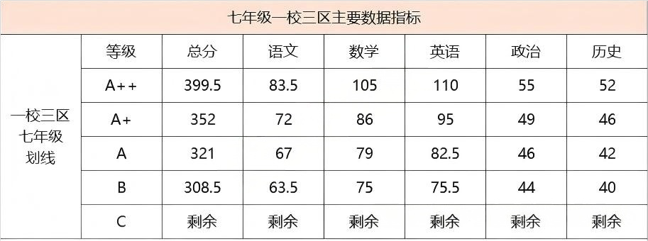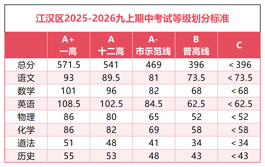 汉阳区部分学校七年级期中等级分段出炉: 七年级 武珞路实验九年级期中考试情况: 565,三校前10 560,年级前4 559,年级第5 549,单校年级第10名,三校第19名 541.5,三校50名 540+,年级前20名 530.5,三校80名 522,三校100左右 503,等级A++,三校前260名 一批【A+】:武汉一高 全区前700名 二批【A】:十二高 全区前1200名 三批【A-】:含常青、19高 、68 高(A-以 68 高为标准) 四批【B】:武汉七中(普高线(包含普职融通高中班) 九年级 七年级 八年级 九年级 七年级 八年级 九年级 A+:484分,对应省示范线 A:413分,对应市示范线 A-:399分,对应市示范希望线 B+:384分,对应普高线 C+:366分,对应民办线